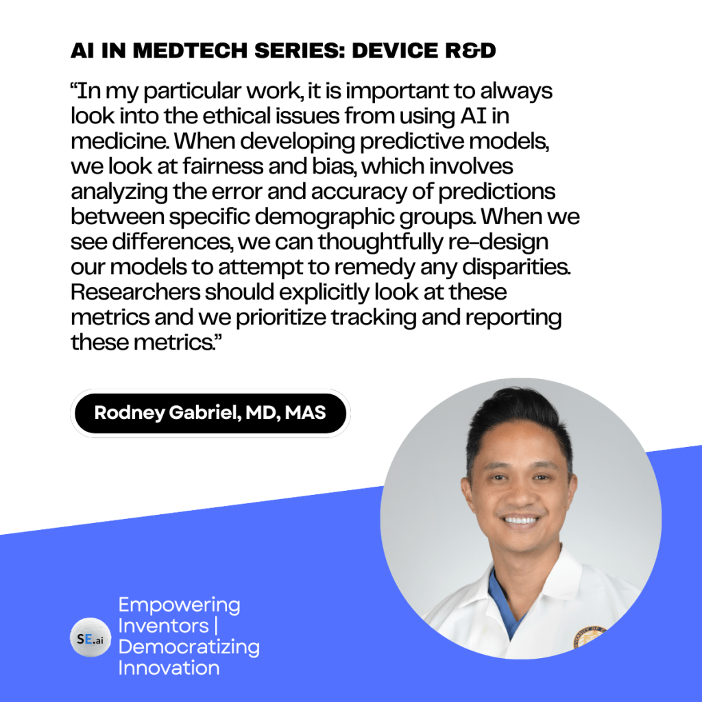 “In my particular work, it is important to always look into the ethical issues from using AI in medicine. When developing predictive models, we look at fairness and bias, which involves analyzing the error and accuracy of predictions between specific demographic groups. When we see differences, we can thoughtfully re-design our models to attempt to remedy any disparities. Researchers should explicitly look at these metrics and we prioritize tracking and reporting these metrics.”